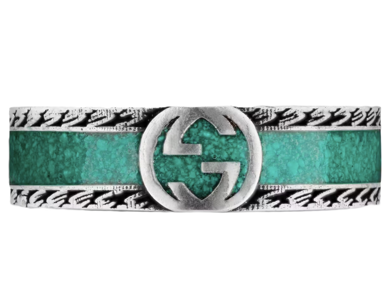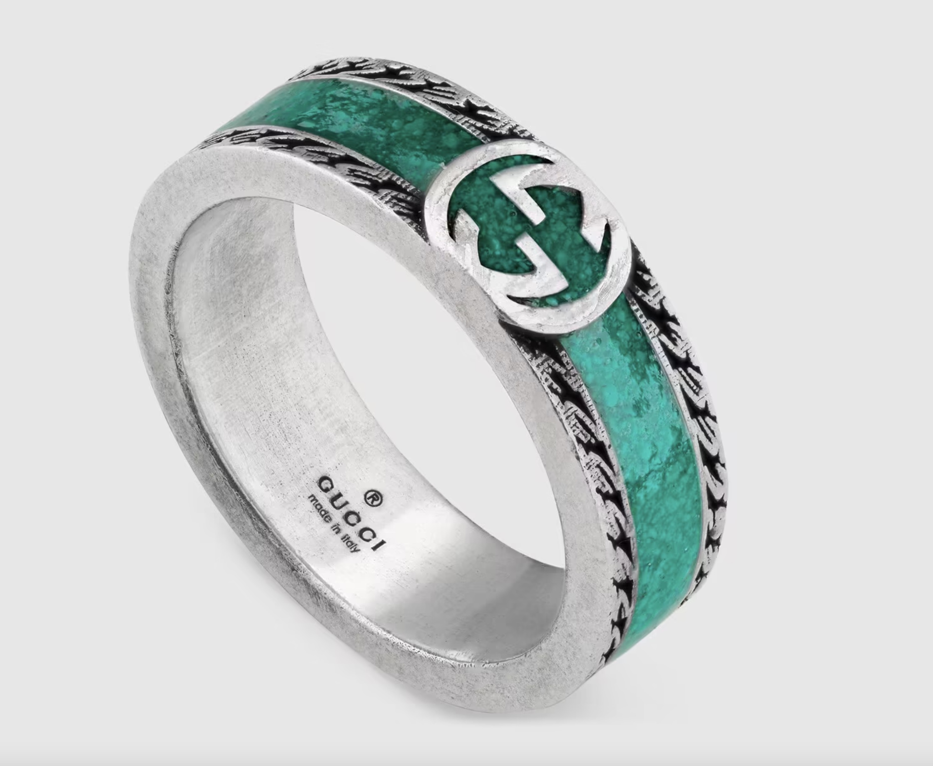 The initials of Guccio Gucci define this ring as the Interlocking G. Presenting fashion as timeless, the latest collection brings recognizable House symbols to the fore. Crafted from silver, the style is accentuated by vibrant turquoise enamel and a textured trim.